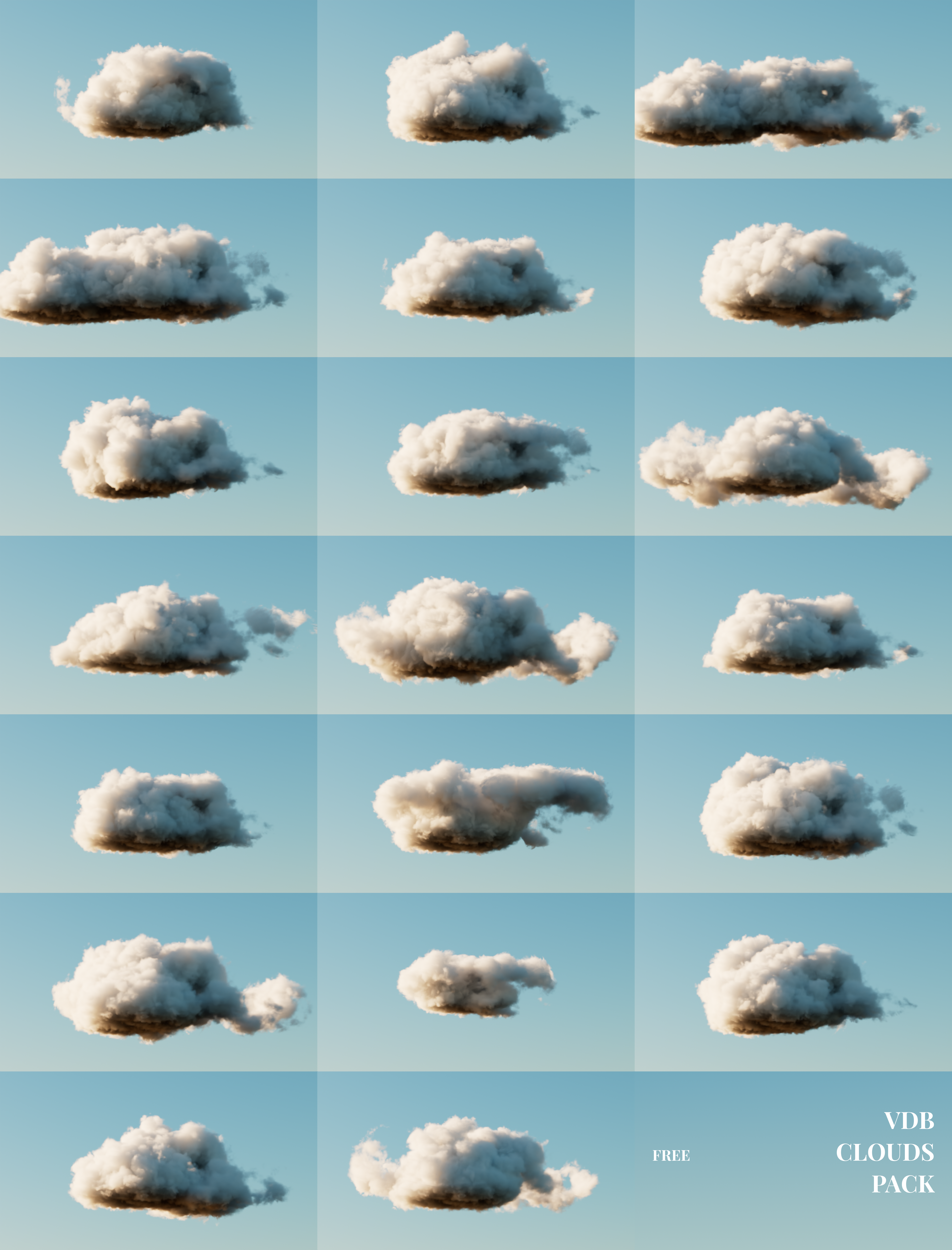I am very pleased to share with you my procedural hi-res clouds pack. The clouds were created using Houdini, they come in .vdb file format and should be usable in any 3D application.